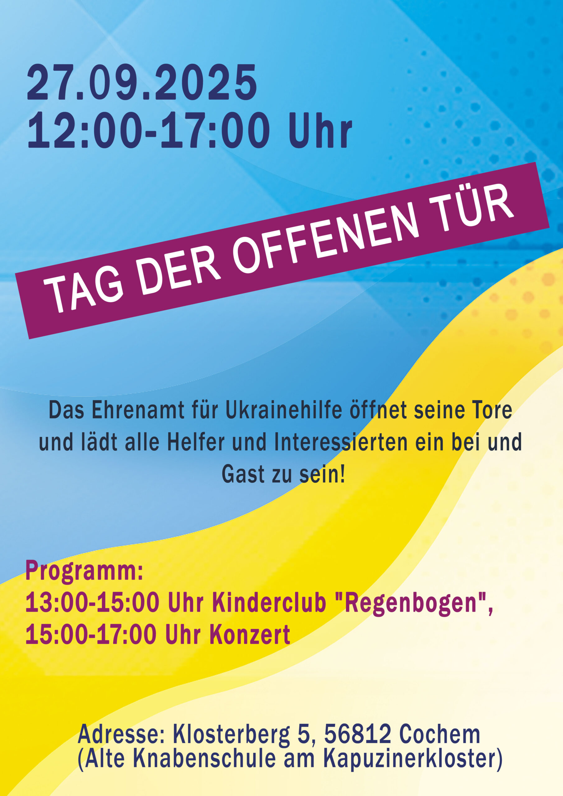 5-6.7.25 Kunst am Fluss im Vereinshaus am Klosterberg in Cochem erwartet am ersten Tag unsere Gäste lebendige ukrainische Kunst mit Bilderausstellung, Chorgesang und Tanzvorführungen. Für Erwachsene Besucher gibt es ein zweitägiges Workshop mit Lebensbaum (Voranmeldung ist erwünscht) und folgender Workshop mit Kochkunst, wo ukrainisches traditionelles Hauptgericht zubereitet wird, Varenyky (gefüllte Teigtaschen) mit anschließendem Genuss dieser […]